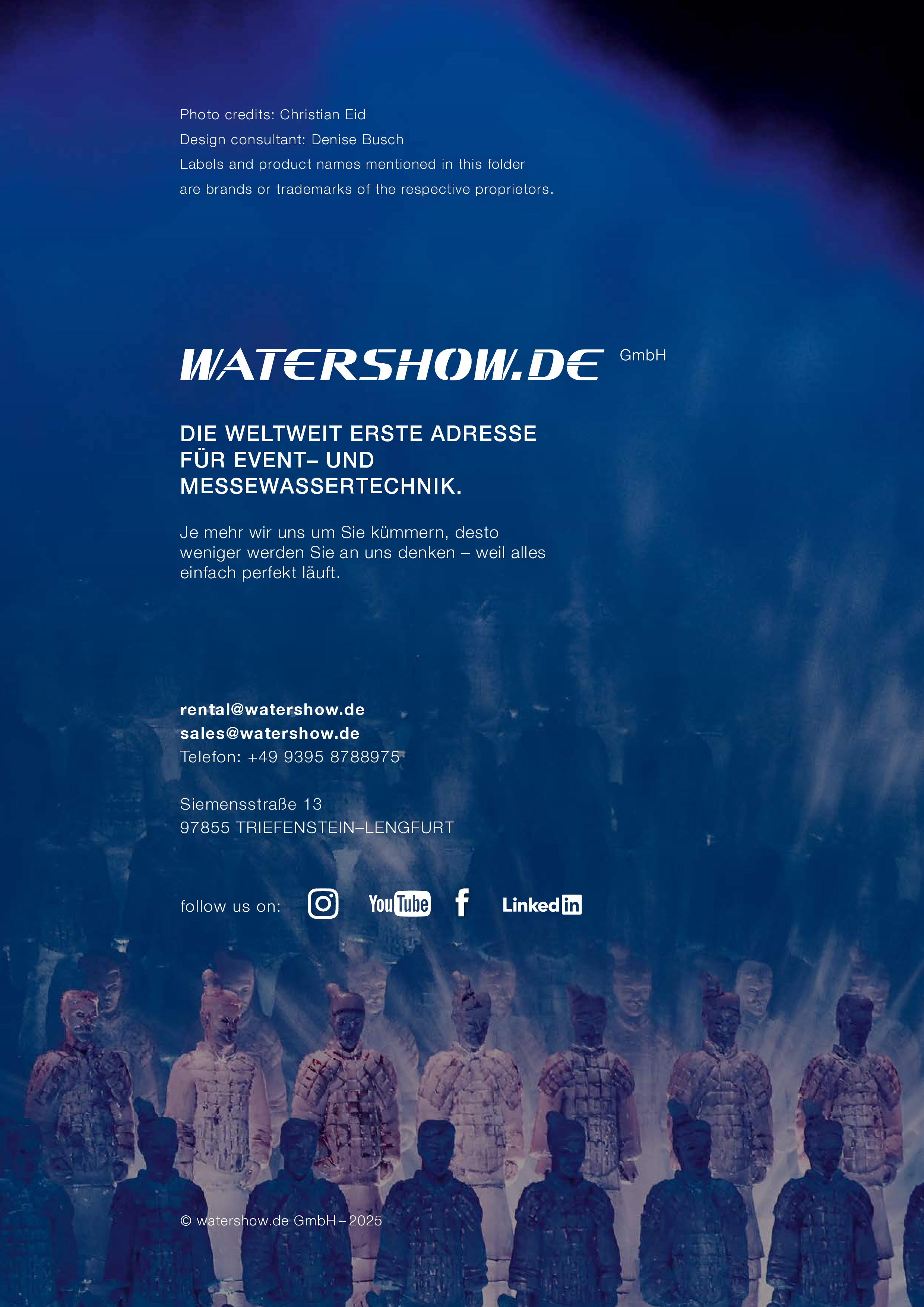 Watershow.de GmbH transforms water into unforgettable experiences. From dazzling fountains and elegant water walls to high-tech waterscreens that write logos and images with falling drops — every show is a one-of-a-kind highlight. With custom solutions, flawless engineering, and stunning visual impact, Watershow.de makes brands shine and events unforgettable.